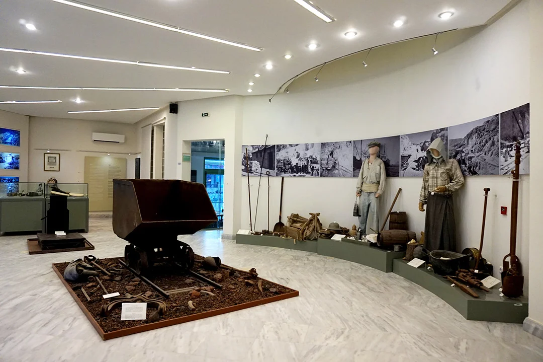 The museum spans two floors: the ground and first floors, with additional spaces in the basement. On the ground floor, visitors are introduced to the mining history of Milos through photographs, illustrations, and maps. Authentic tools and instruments used in the mining process are displayed alongside representations of both historical and current mining operations, as well as environmental restoration efforts.